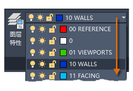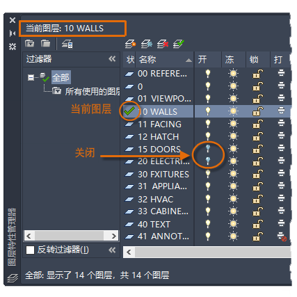 如图所示,图层 10 WALLS 是当前图层。所有新对象都将自动放置在该图层上。在图层列表中,图层 10 WALLS 旁边的绿色勾选标记确认它是当前图层。