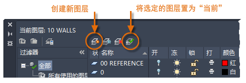 要创建新图层,请单击显示的按钮并输入新图层的名称。要将其他图层置为当前图层,请单击图层,然后单击指示的按钮。