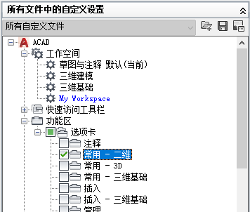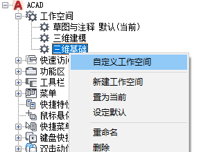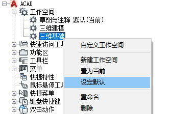 可以将 CUIx 文件中的工作空间标记为默认。将工作空间设置为默认可以确定,在第一次将 CUIx 文件加载到程序中后,或在使用 CUILOAD 命令加载 CUIx 文件之后,应该恢复此工作空间。
