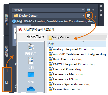 - 要从“设计中心”文件夹中选择其他库图形,请确保“库”选项卡为当前选项卡 (1),然后单击“文件导航”按钮 (2)。