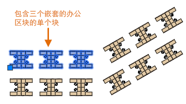 - 在当前图形中创建的一个或多个块定义。例如,用户可能希望基于在该图形中重复出现的一组对象(例如,以下包含多个“嵌套”块的办公室布置)创建块。办公室布置中使用的所有块都组合成“单个”块,以用于多个放置。