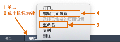 首先,您应在访问布局选项卡 (1) 时,在选项卡 (2) 上单击鼠标右键,然后将该选项卡 (3) 重命名为比“布局 1”更具体的名称。参照特定 ANSI 或 ISO 尺寸的名称可能是一个不错的选择。