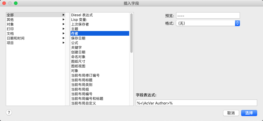 在“字段名称”中选择“命名对象”时,将显示图形中命名对象的类型列表。选择“对象”时,将显示选定对象的类型。使用“选择对象”按钮可以暂时关闭该对话框,然后在图形中选择对象。