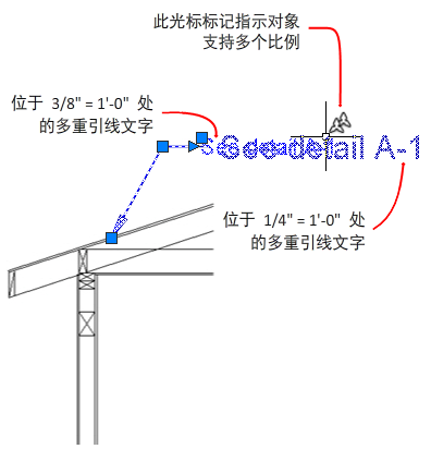 下图显示了一条多重引线,并为它指定了两种不同的对象比例。
