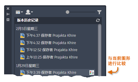 在新的“图形历史记录”选项板中查看云中存储的图形的版本历史记录,可以在其中将这些图形与图形的当前版本进行比较。