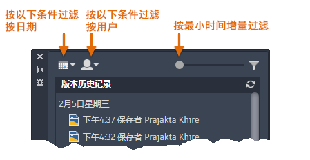 登录后,“图形历史”选项板将显示该图形的任何早期版本的列表。