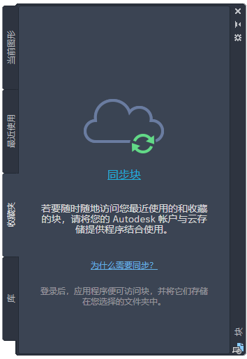 在此更新中,当使用 Autodesk 帐户并将块与云存储提供程序同步时,您最近使用可块和收藏块可以跨设备进行访问。