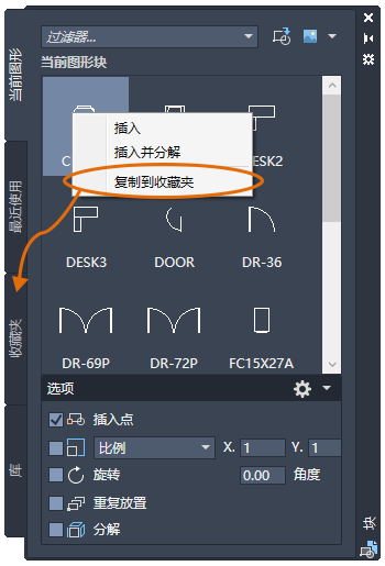 现在,“块”选项板允许您将常用块复制到新的“收藏夹”选项卡。可以将块从“块”选项板中的任意选项卡复制到“收藏夹”选项卡。