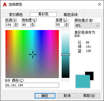 使用真彩色(24 位颜色)指定颜色设置(使用色调、饱和度和亮度 [HSL] 颜色模式或红、绿、蓝 [RGB] 颜色模式)。使用真彩色功能时,可以使用一千六百多万种颜色。“真彩色”选项卡上的可用选项取决于指定的颜色模式(HSL 或 RGB)。