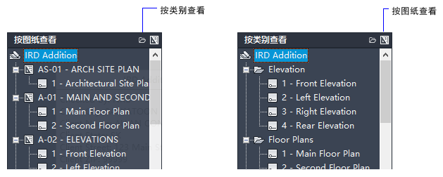 在“图纸列表”选项卡上,可以将图纸整理为集合,这些集合被称作子集。在“图纸视图”选项卡上,可以将视图整理为集合,这些集合被称作类别。