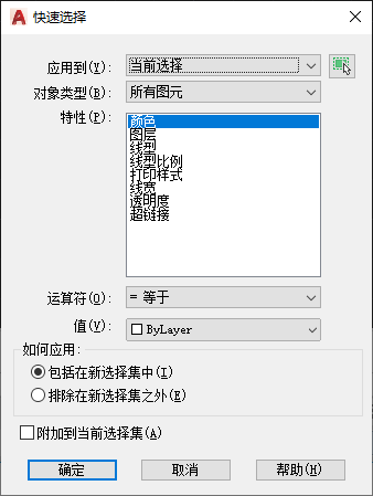 如果选择了“附加到当前选择集”,过滤条件将应用到整个图形。