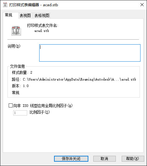 显示有关编辑的打印样式表的信息:打印样式编号、路径和“打印样式表编辑器”的版本号。