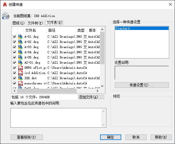 注: 如果该列表中的某个图纸不可用,该图纸将由传递包中的另一张图纸参照(作为外部参照),并且不可用的图纸自动包含在传递包中。