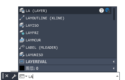 如果禁用自动完成功能,则在命令行中键入一个字母并按 Tab 键以循环显示以该字母开头的所有命令和系统变量。按 Enter 键或空格键来启动命令或系统变量。