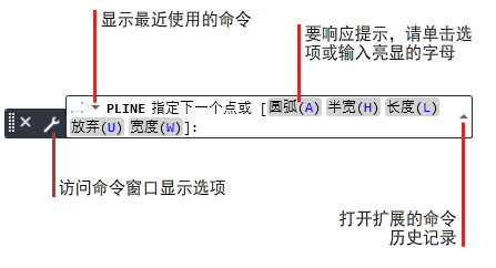 在您输入命令后,您可能会看到显示在命令行中的一系列提示。例如,输入 PLINE 并指定第一个提示后,将显示以下提示: