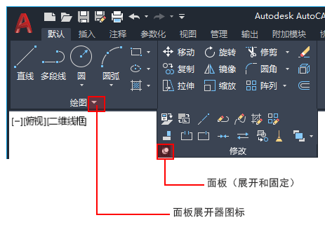 功能区由一系列选项卡组成,这些选项卡被组织到面板,其中包含很多工具栏中可用的工具和控件。