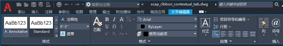 当您选择特定类型的对象或启动特定命令时,将显示上下文功能区选项卡而非工具栏或对话框。当结束命令时,上下文选项卡会关闭。
