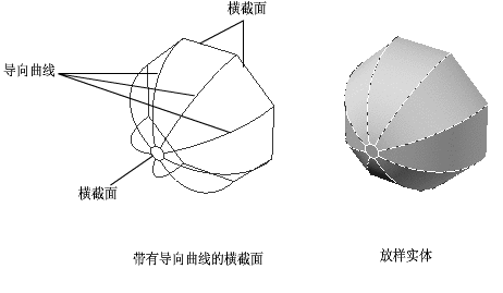 指定控制放样实体或曲面形状的导向曲线。可以使用导向曲线来控制点如何匹配相应的横截面以防止出现不希望看到的效果(例如结果实体或曲面中的皱褶)。