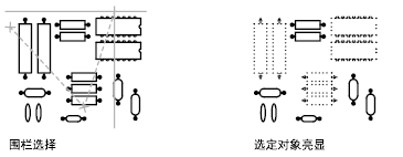 在复杂图形中,使用选择栏。选择栏的外观类似于多段线,将仅选择其通过的对象。电路板图显示了用于选择多个组件的栏。
