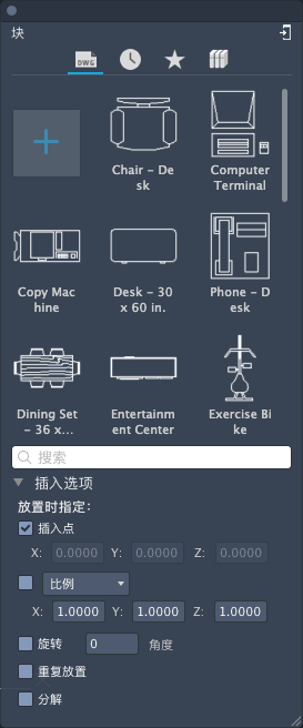 通过从当前图形中的块、最近使用的块、收藏夹或块库中进行选择,来选择要插入的块。还可以浏览并选择要作为块插入的图形。