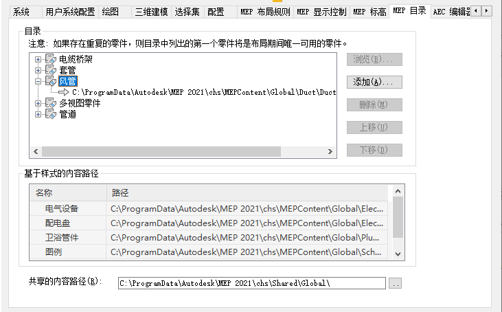 对目录重新排序 | 选择目录,然后根据需要单击“上移”或“下移”。 在“MEP 目录”选项卡上列出的目录顺序,也是在布局过程中选择零件时列出的目录顺序。 |