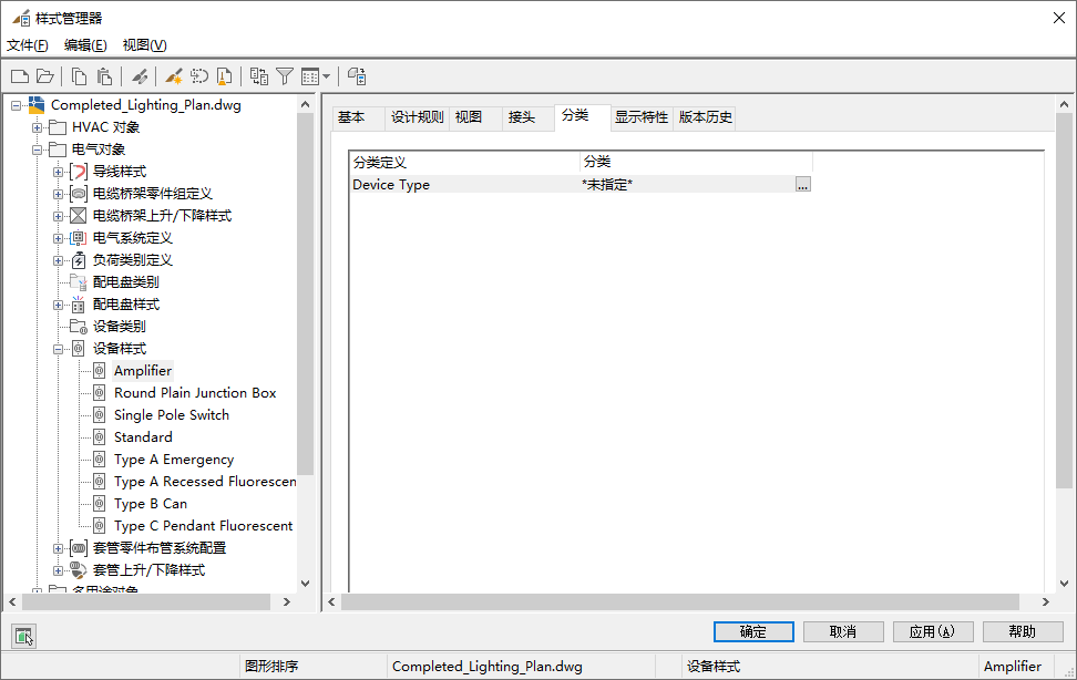 适用于设备的分类定义显示在每种设备样式的“分类”选项卡上。在配置设备样式时,可以在该选项卡上指定“设备类型”分类定义以及任何自定义分类定义的分类。随软件附带的大多数设备样式均指定“设备类型”分类定义的分类。