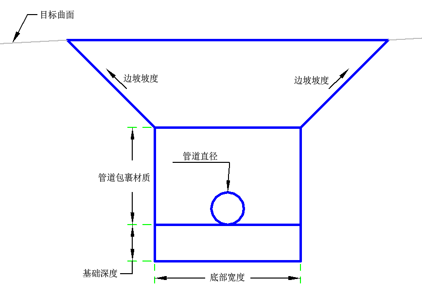 沟渠底部的高程是从纵断面坡面线高程减去一半管道直径以及基础深度而计算得出的。水平沟渠底部连接将对称地放置在该高程处的附着点偏移周围。管道包裹材质深度用于提供管道周围的材质。边坡将向上延伸到现有曲面。水平基础连接将沿给定的深度放置在沟渠底部上方。