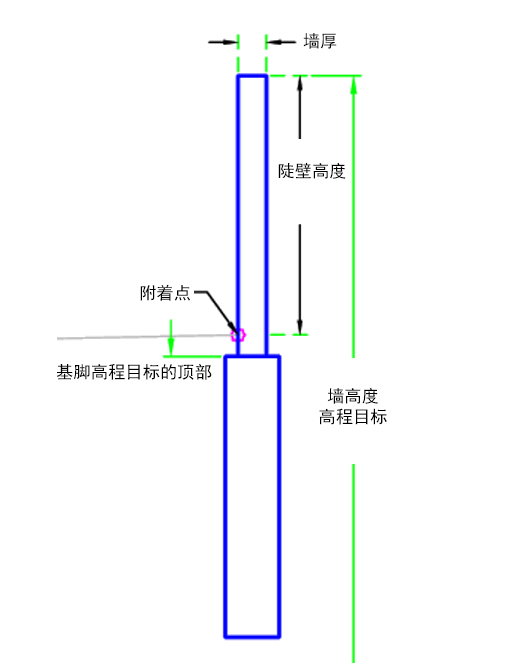 | 陡壁高度 | 可用于替代墙高度,将墙顶高程关联到纵断面高程。以下对象类型可用作用于指定高程的目标:纵断面、三维多段线、要素线或测量地物。 | 可选 |