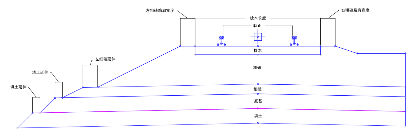 | 粗碴边坡(左侧和右侧) | 粗碴材质侧的坡度。粗碴材质顶部的坡度应与铁路超高造成的枕木坡度相一致。 | 坡度(非负数) | 2:1 |