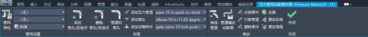 使用“压力管网纵断面布局”功能区可以处理纵断面图中的压力管网。