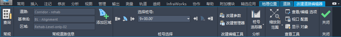 “改建道路编辑器”功能区选项卡