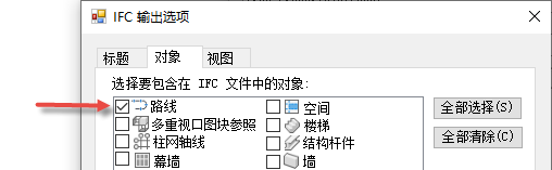 路线。必须选择版本 4x1 才能选中“IFC 导出选项”对话框的“对象”选项卡上的“路线”复选框。如果该复选框不可选中,请单击“表头”选项卡并选择版本 IFC 4x1。