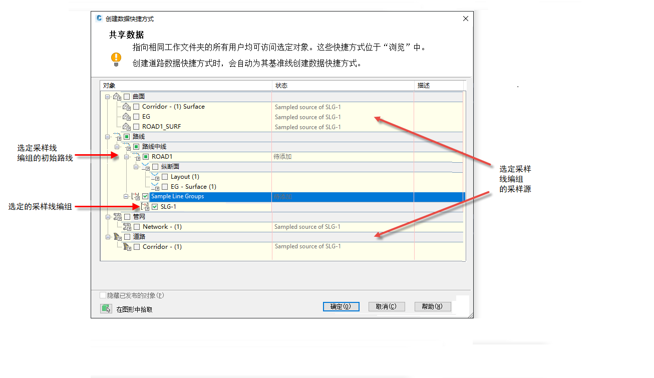 为采样线编组创建数据快捷方式时,“创建数据快捷方式”对话框的“状态”列中会显示注释,以通知您图形中的哪些项目是采样线编组的采样源。