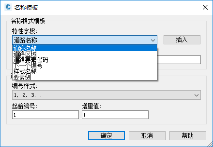除了“样式名称”和“下一编号”特性,还可为要素线名称指定多个特性,这有助于相对于上级道路对其进行标识,包括道路要素代码、道路名称、道路区域和要素侧。
