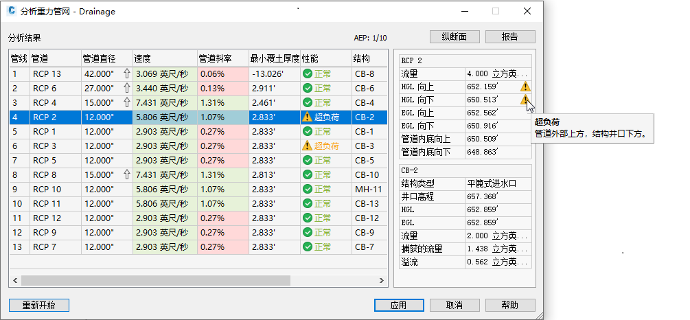 在结果表中选择行时,该行将在图形的平面图和纵断面图中亮显,并将在对话框的右侧显示其他详细信息。
