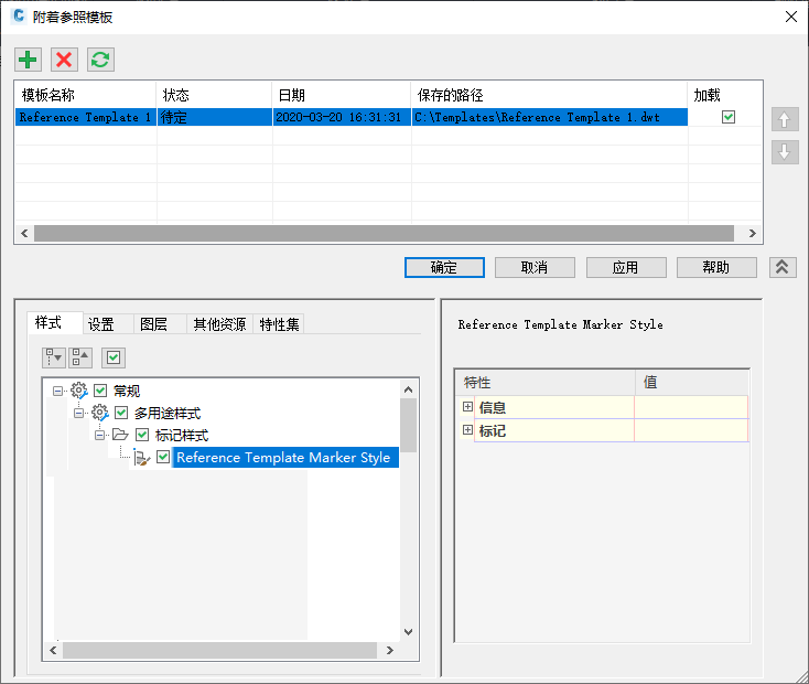 注: 如果清除“加载”复选框并单击“应用”或“确定”,系统将从图形中删除参照模板中未使用的组件,并且不会使用对参照模板进行的其他更改更新该图形。已使用的组件(如图层)将保留在图形中。