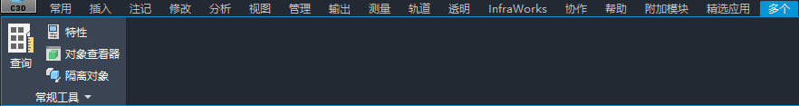 如果同时选定多种类型的对象,则功能区中会显示“多个”上下文选项卡。例如,如果选择一个管网对象和一个路线对象,则会显示“多个”上下文选项卡。