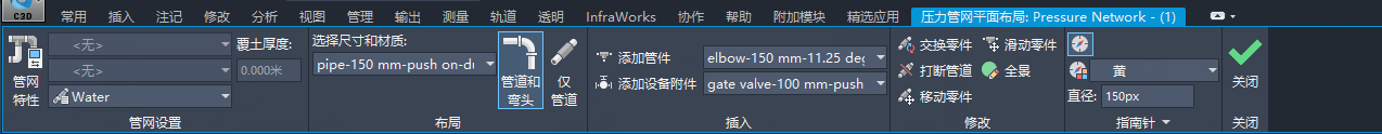 使用基于零件的“压力管网平面布局”功能区可以在平面图中创建和编辑基于零件的压力管网。