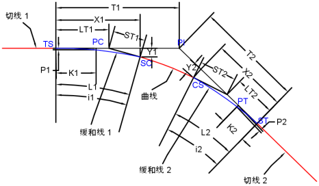 | i1 | 缓和曲线曲线 L1 的圆心角,此圆心角为螺旋角。 |