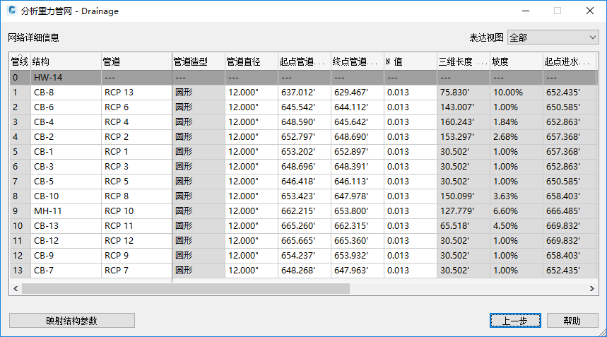 您可以单击“映射结构参数”按钮打开映射排水结构参数对话框。您可以使用“映射排水结构参数”对话框将零件生成器零件的参数映射到“分析重力管网”命令所需的参数。