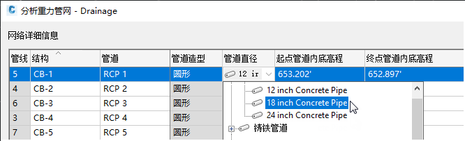 可以从下拉列表中选择管网零件列表中的可用管道尺寸。