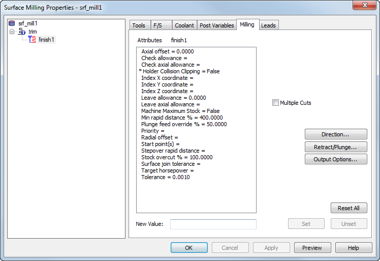 公差 - 该属性用于控制刀具路径跟随曲面的精确程度。如果零件显示为有镶嵌面,请将公差设置为较小的值。