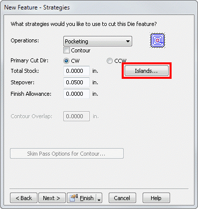 在“新的特征”向导的“策略”页面(或特征的“属性”对话框的“策略”)上选择“型腔”或“之字形”作为操作时,您看到一个标记有“岛”的按钮。