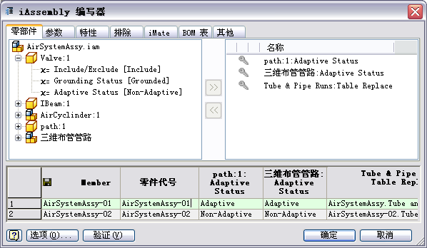 “iPart/iAssembly 编写器”。 主管路部件的文件名显示在候选对象列表中,默认情况下为“三维布管管路”。自适应状态被自动选入配置表。
