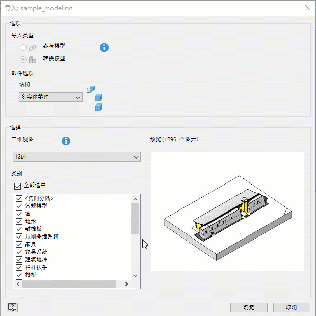 “三维视图”列表中,选择要导入的三维视图。要导入的 Revit 元素的数量列在预览上方。