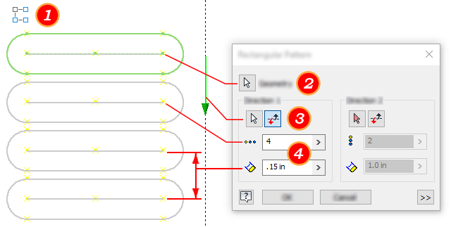 - 在“矩形阵列”对话框中,单击“方向 1”下的选择工具,然后选择几何图元以定义阵列的第一个方向。