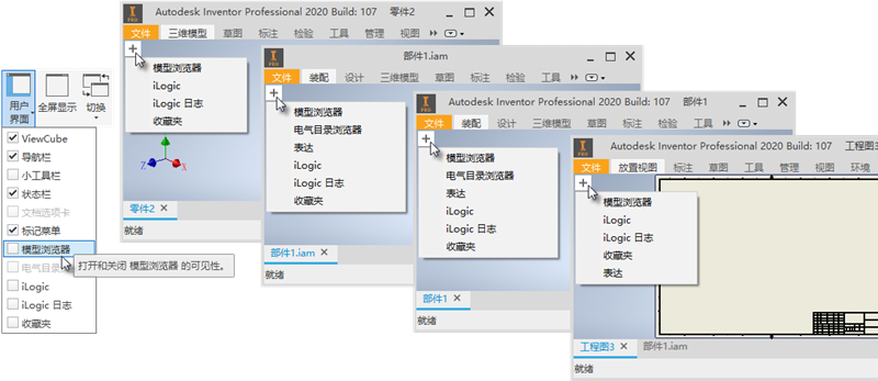 - 面板。通过拖动选项卡,可以在现有面板中移动、添加或删除每个面板。也可以并排、上下固定面板,或者单独取消固定和浮动面板,甚至可以将面板固定在 Inventor 的外侧。