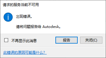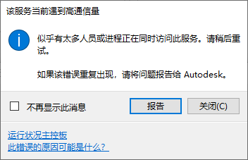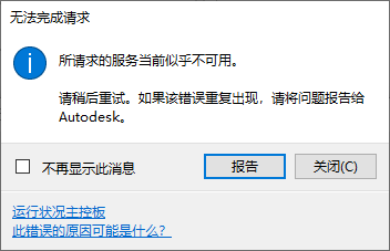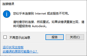 如果已连接到 Internet,但仍收到此错误,请单击运行状况面板链接并检查服务的状态。 如果运行状况面板显示服务按预期工作,而您仍收到此消息,请将此问题报告给 Autodesk 产品支持人员。 |