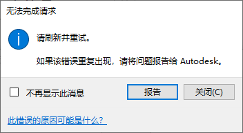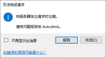 有时,当您联机工作时,会遇到 HTTP 错误消息。这是来自 Autodesk 使用的一项 Web 服务的消息,用来指示出现了一些问题。在大多数情况下,该错误是由于 Autodesk 的一项 Web 服务出现问题所致,需要产品支持人员提供帮助来解决问题。这些类型的错误需要报告给 Autodesk 产品支持人员。在某些情况下,您可能需要执行相应操作来解决该问题。