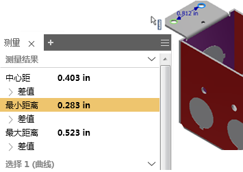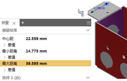 在同一平面上选择以下 2 种类型的几何图元(顶点、直线、圆弧和圆)时,“最大距离”也会显示。